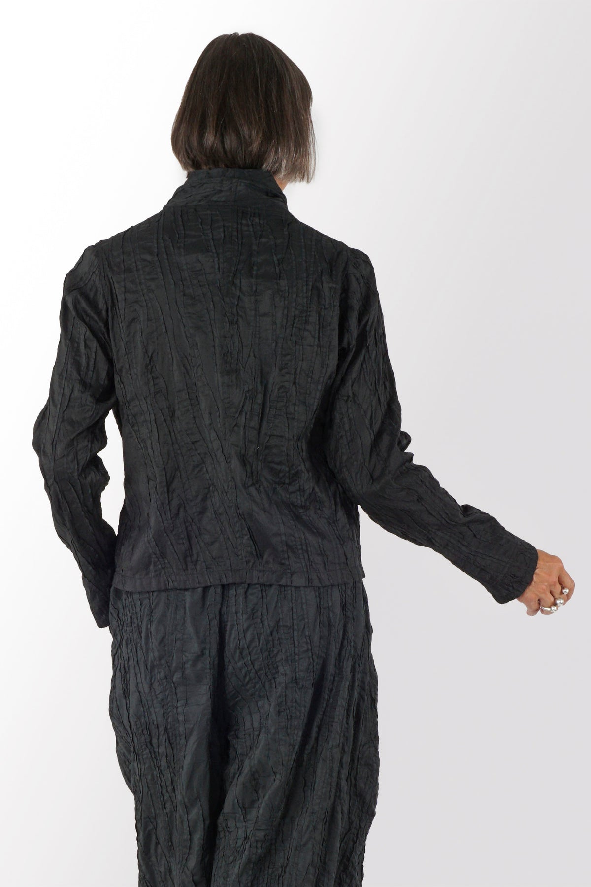 DYED COTTON SILK HEAVY VOILE RANDOM TUCK HIGH-NECK BLOUSE - dr1563-blk -