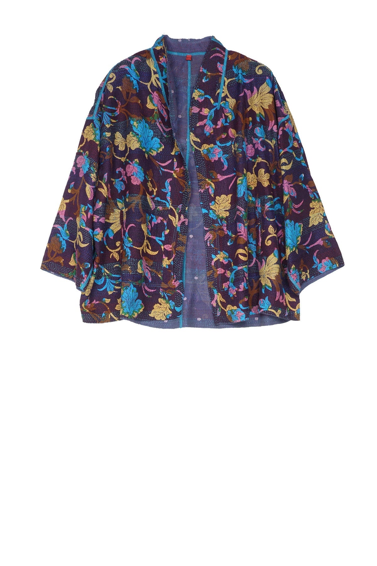 FLORAL SILK PRINT KANTHA GUMP'S STAND COLLAR CROPPED JKT - fs2039-nvy -