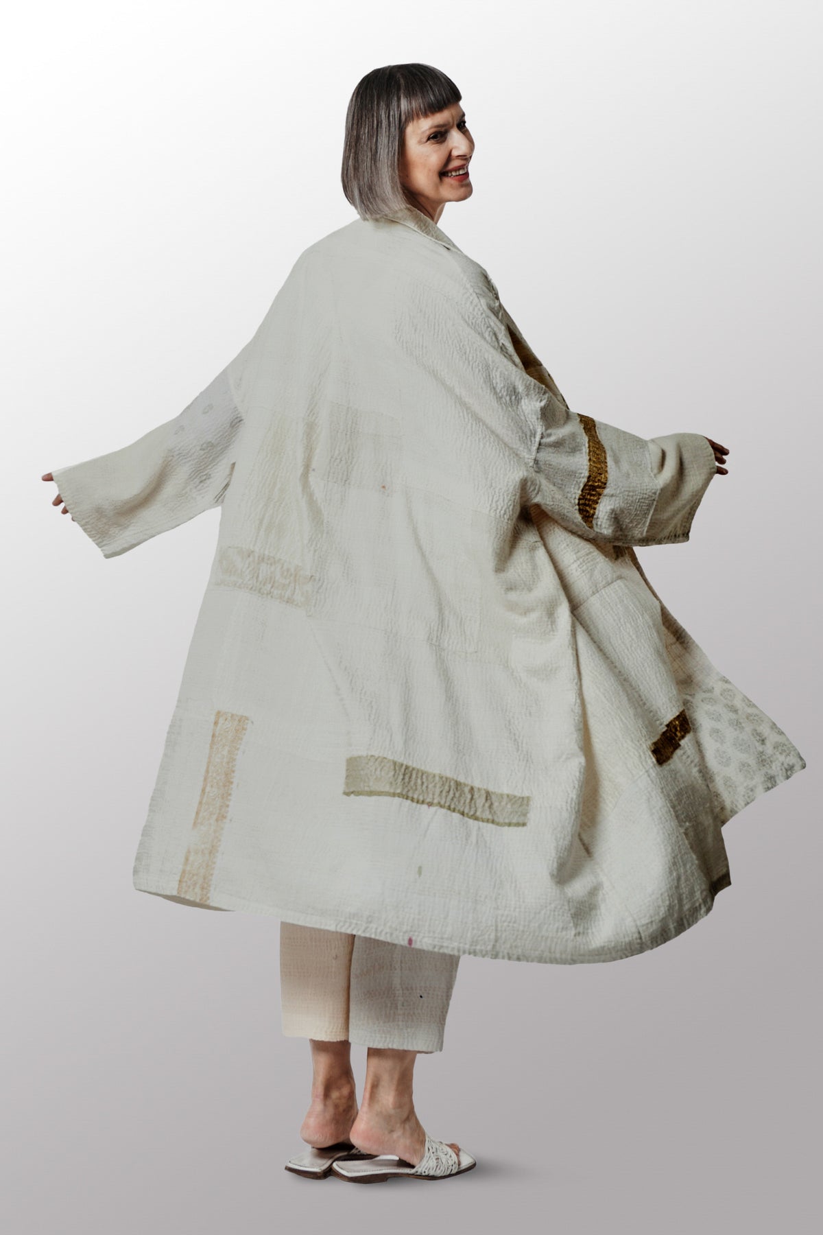 Use a delicate care detergent in cold water, placing the Kantha garment in a mesh bag and washing it with a low-spin or delicate cycle. This will prevent snagging or twisting during the machine cycles.
