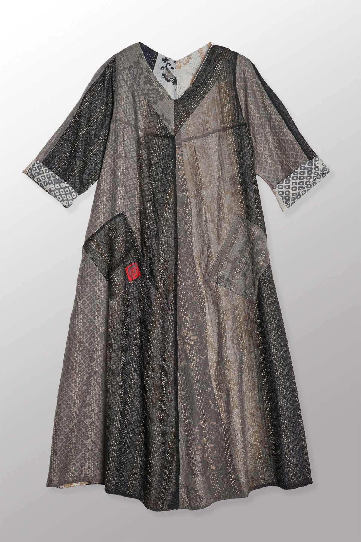KIMONO COTTON KANTHA V-NECK FLARE DRESS - kc2457-gry -