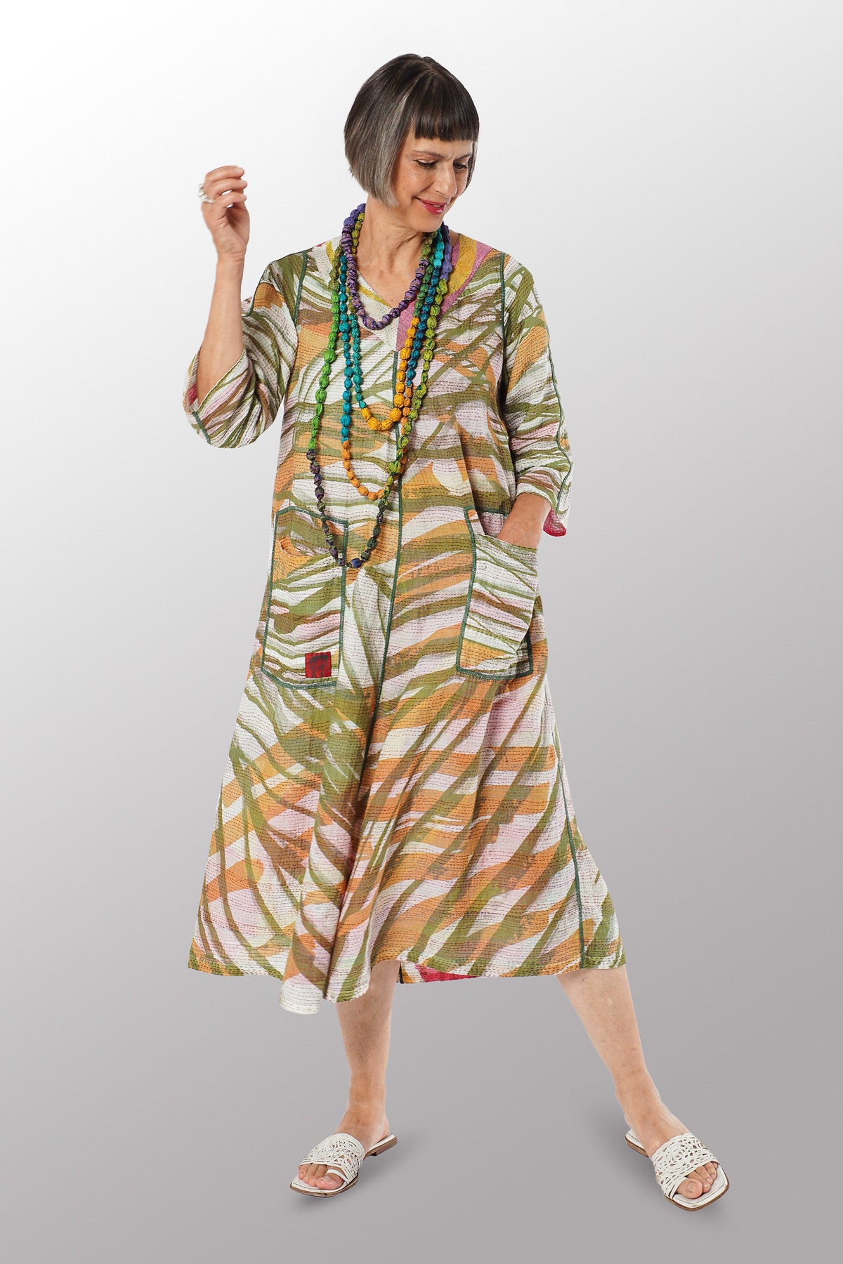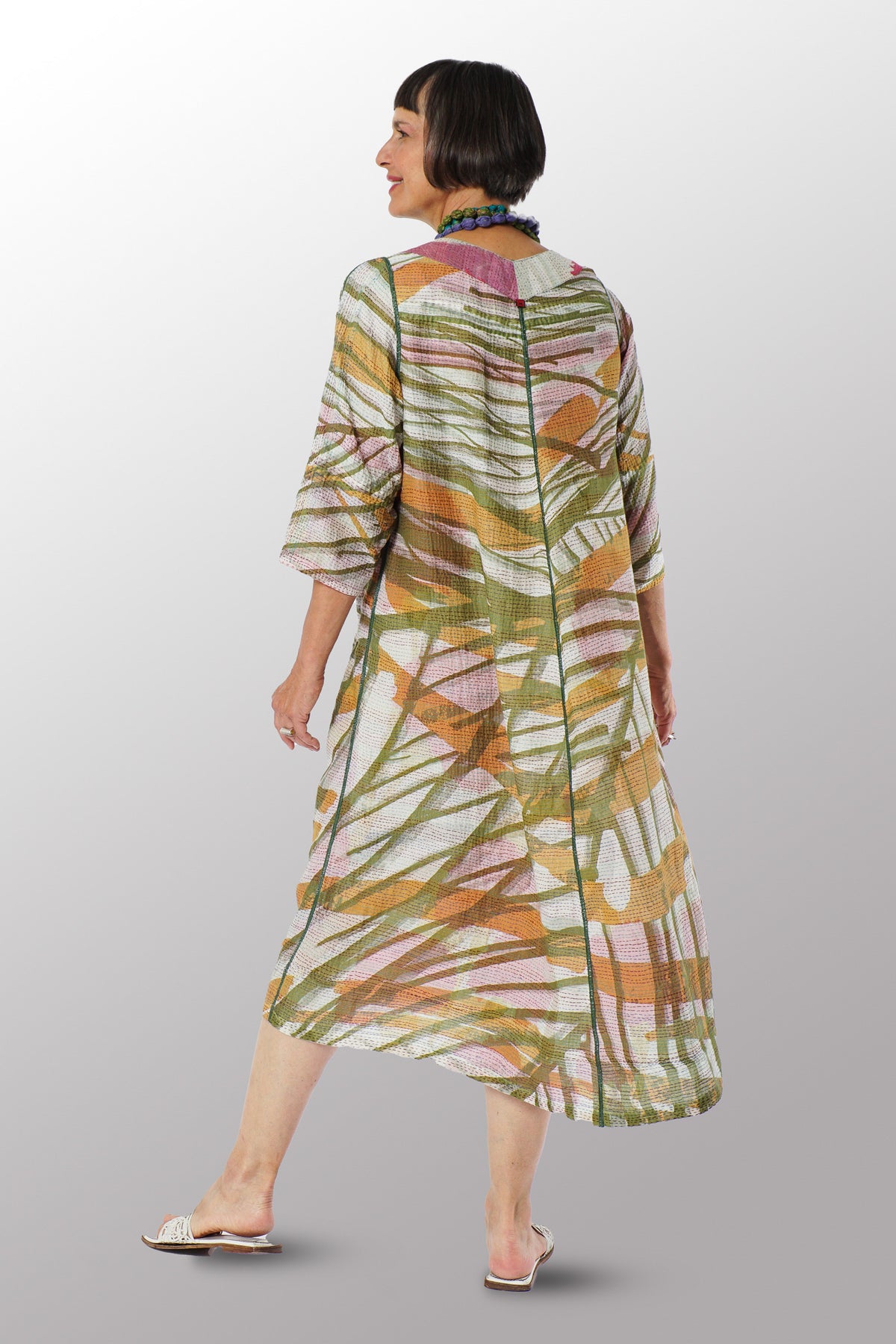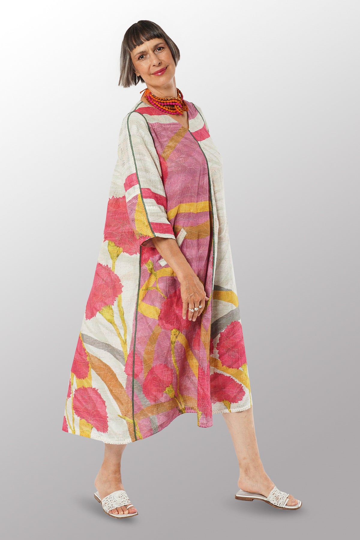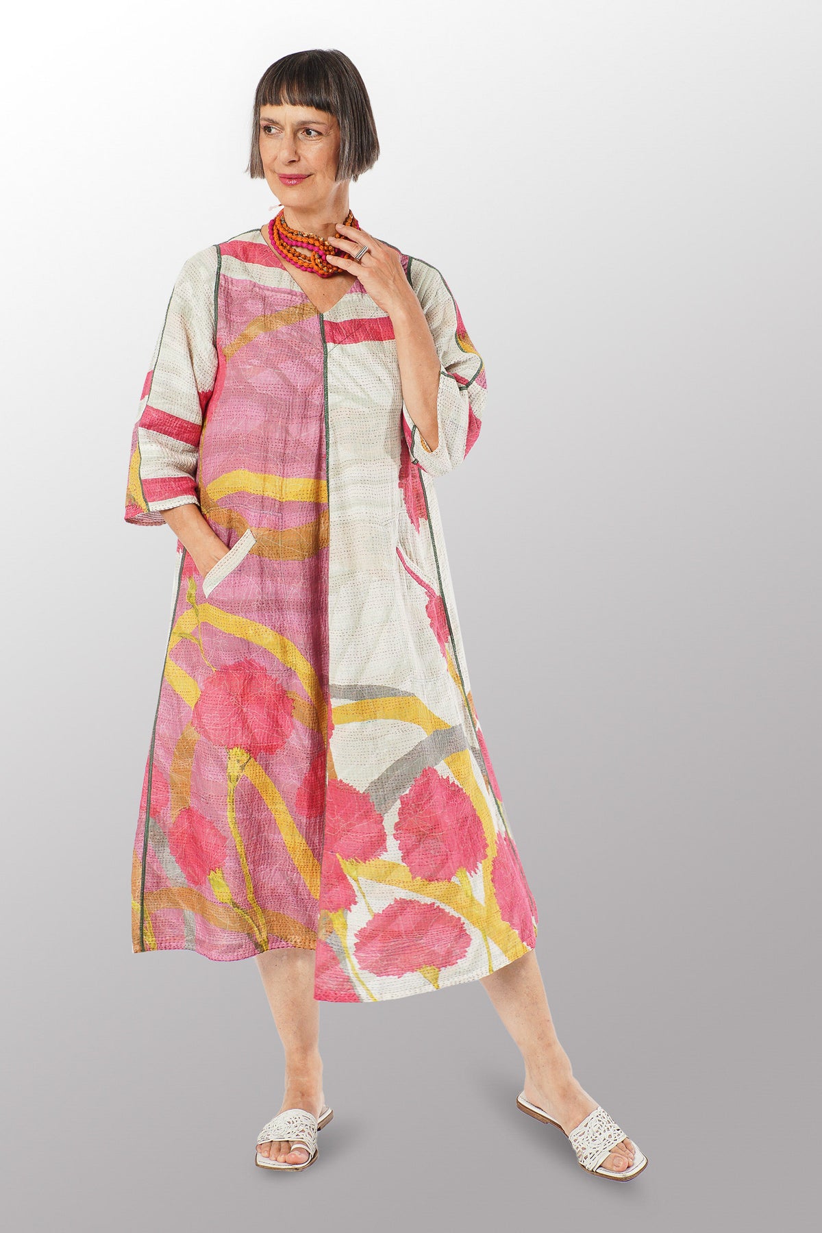 MARIGOLD PRINT KANTHA V-NECK FLARE DRESS - mg2457-pik -