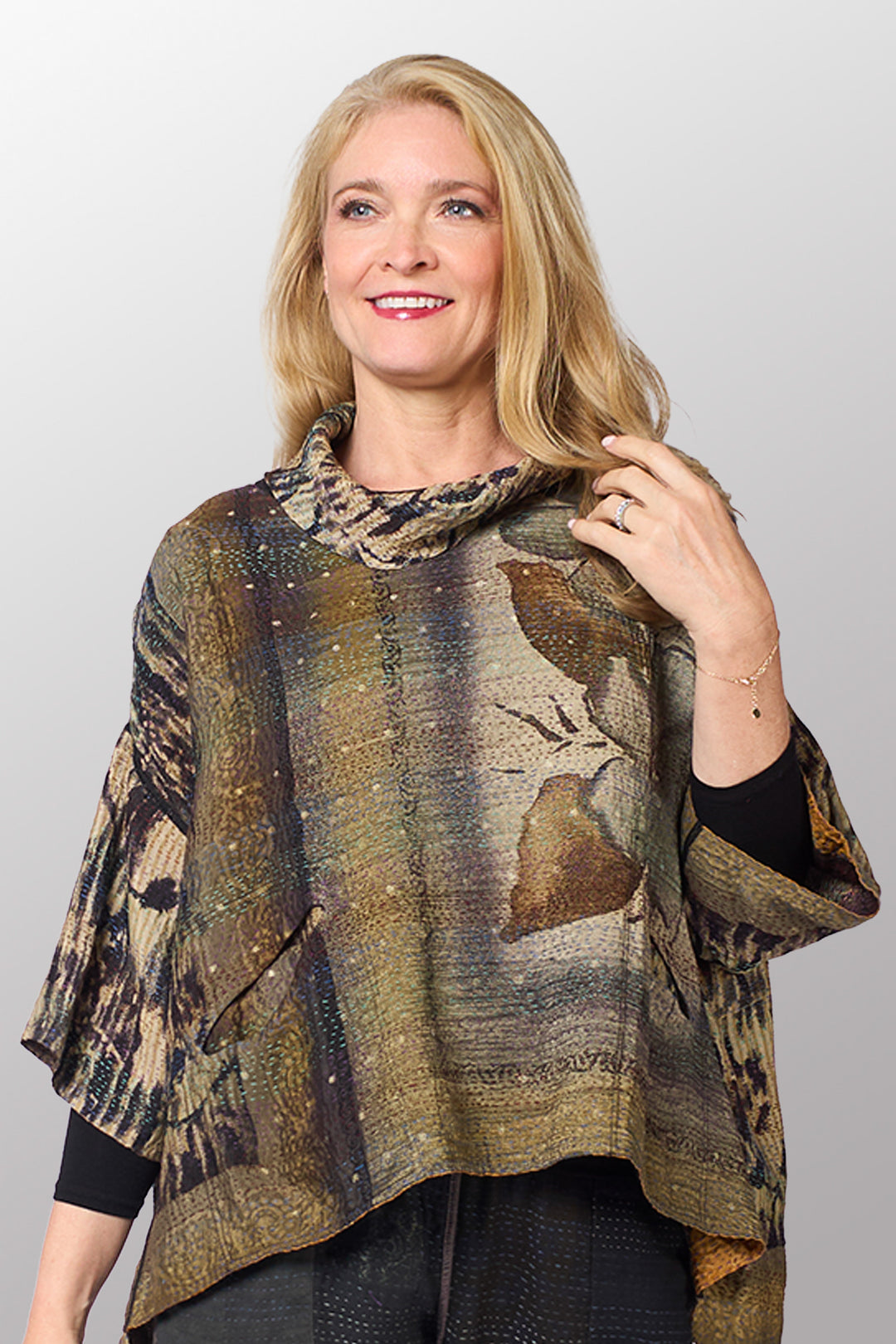 VINTAGE SILK KANTHA DOUBLE COLLAR PONCHO
