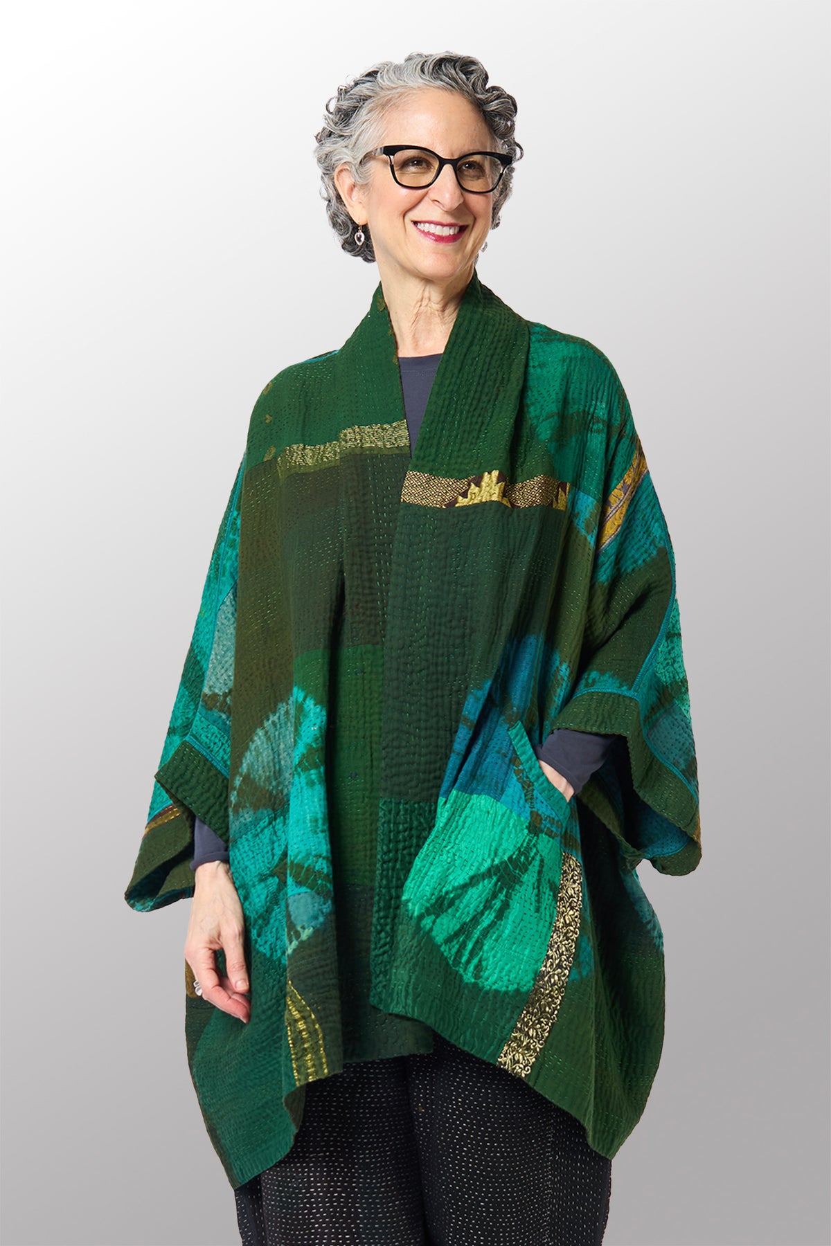 SHIBORI TIE DYE COTTON SILK SW PATCH KANTHA DOUBLE COLLAR PONCHO