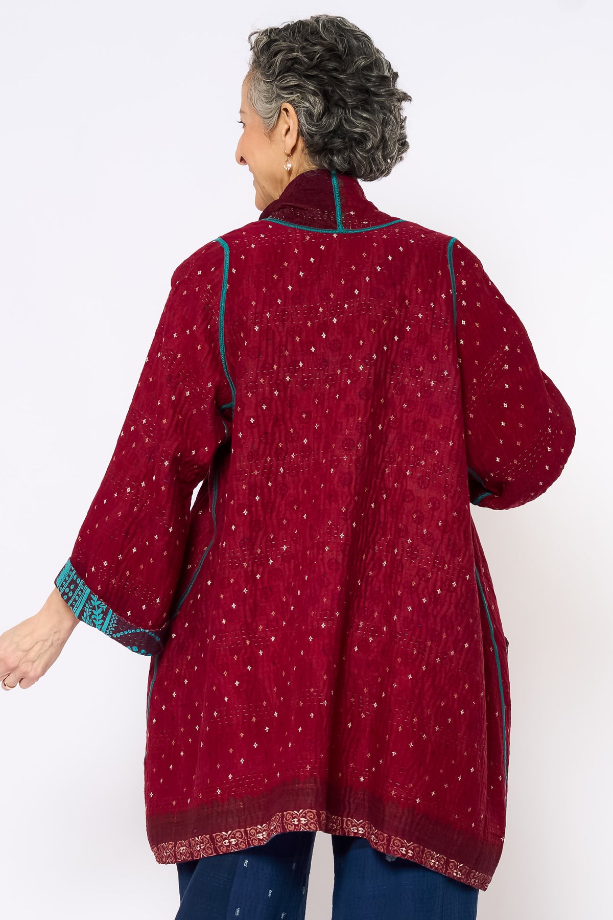 Use a delicate care detergent in cold water without soaking, as this might release some dye. Press and wash without rubbing. Rinse the Kantha garment without wringing.