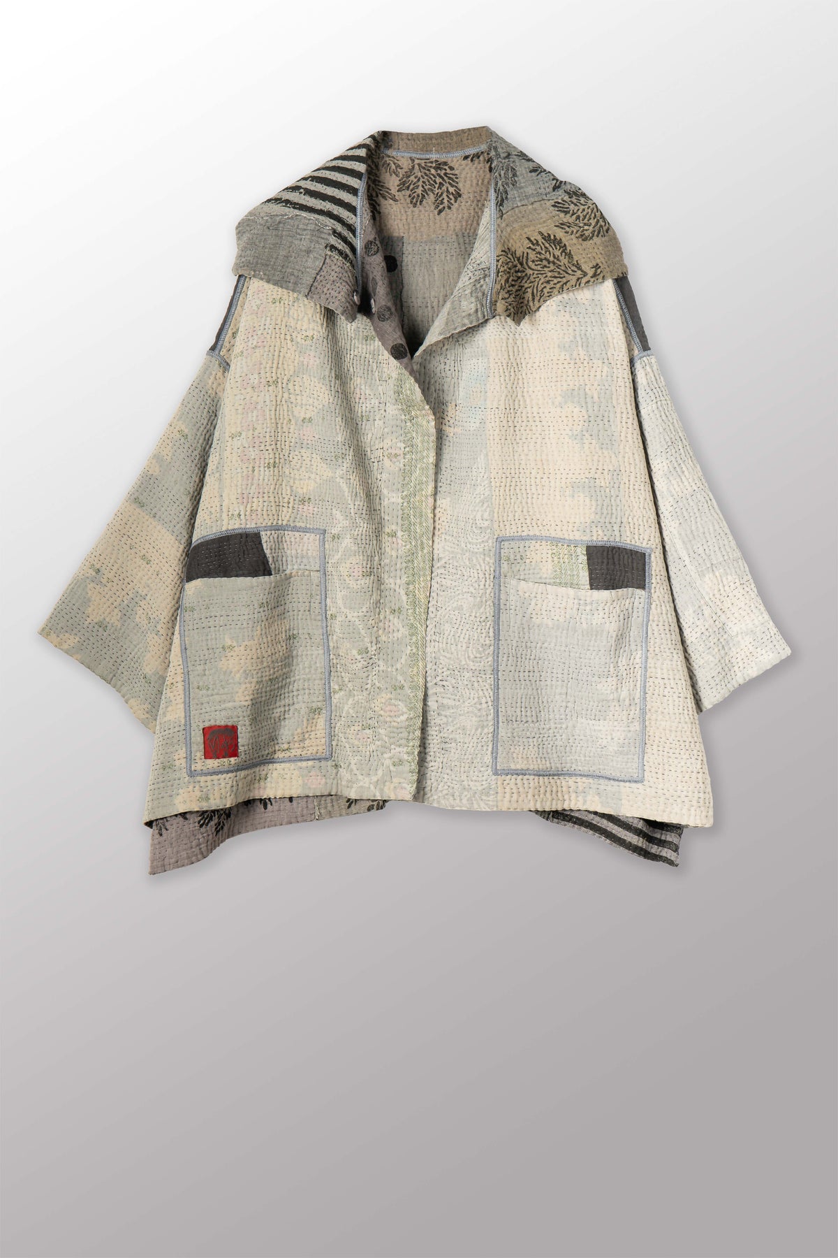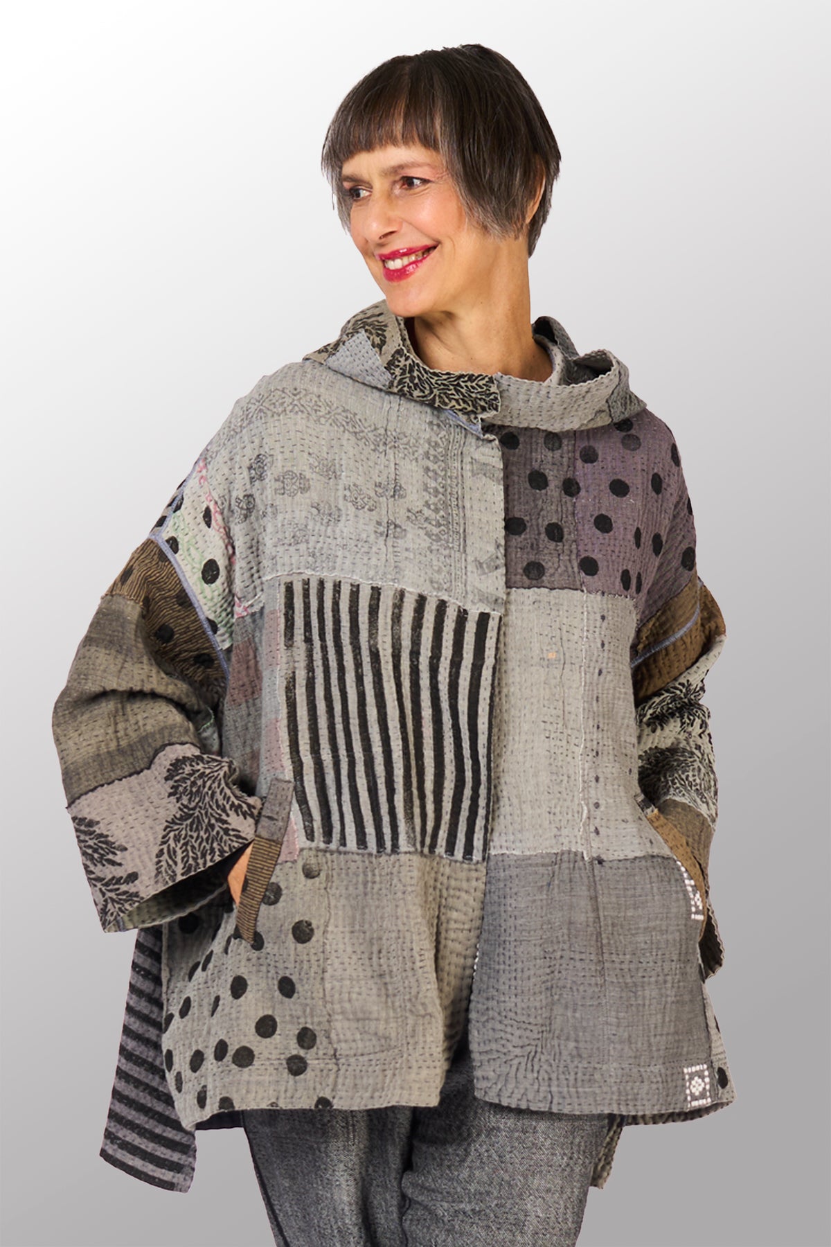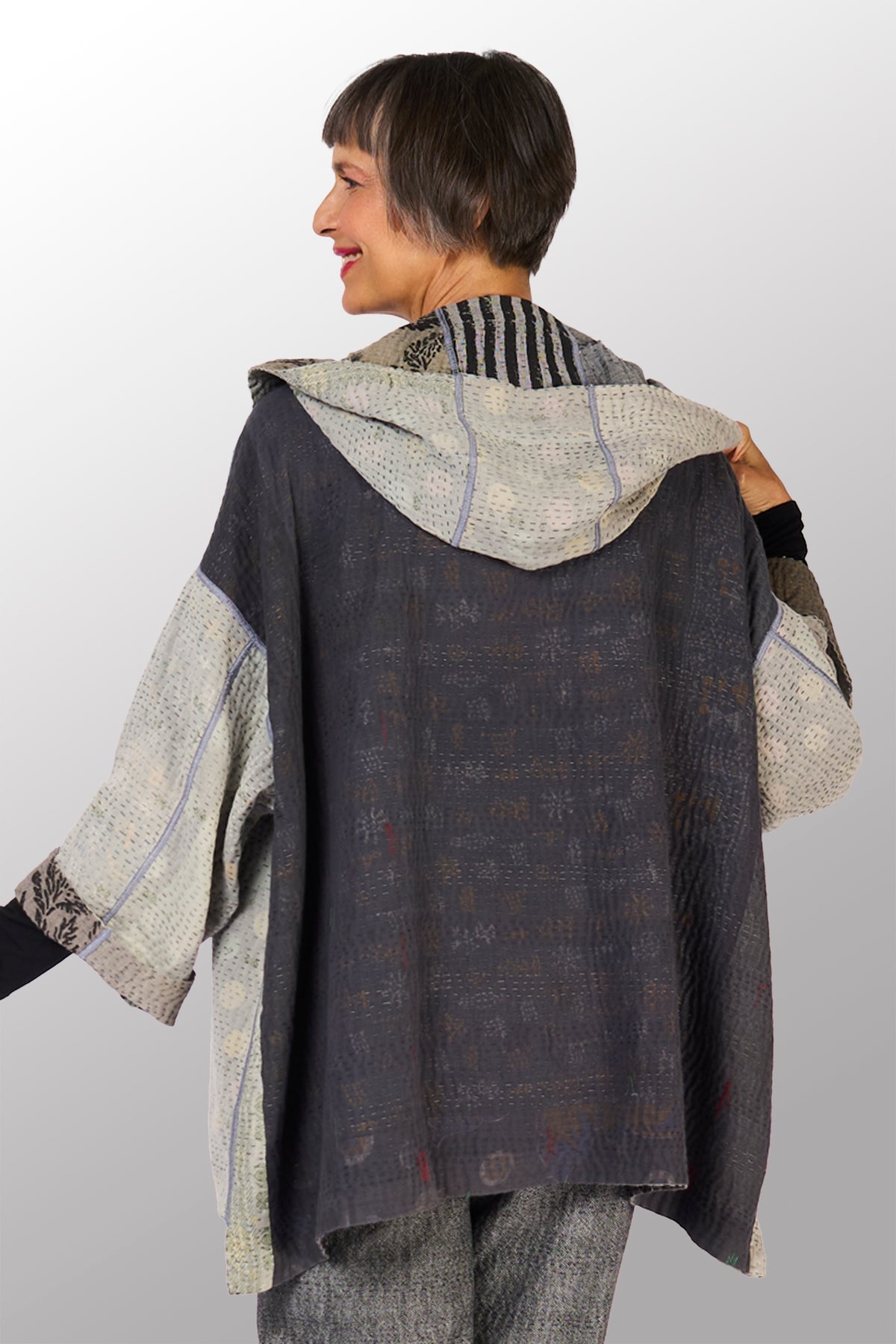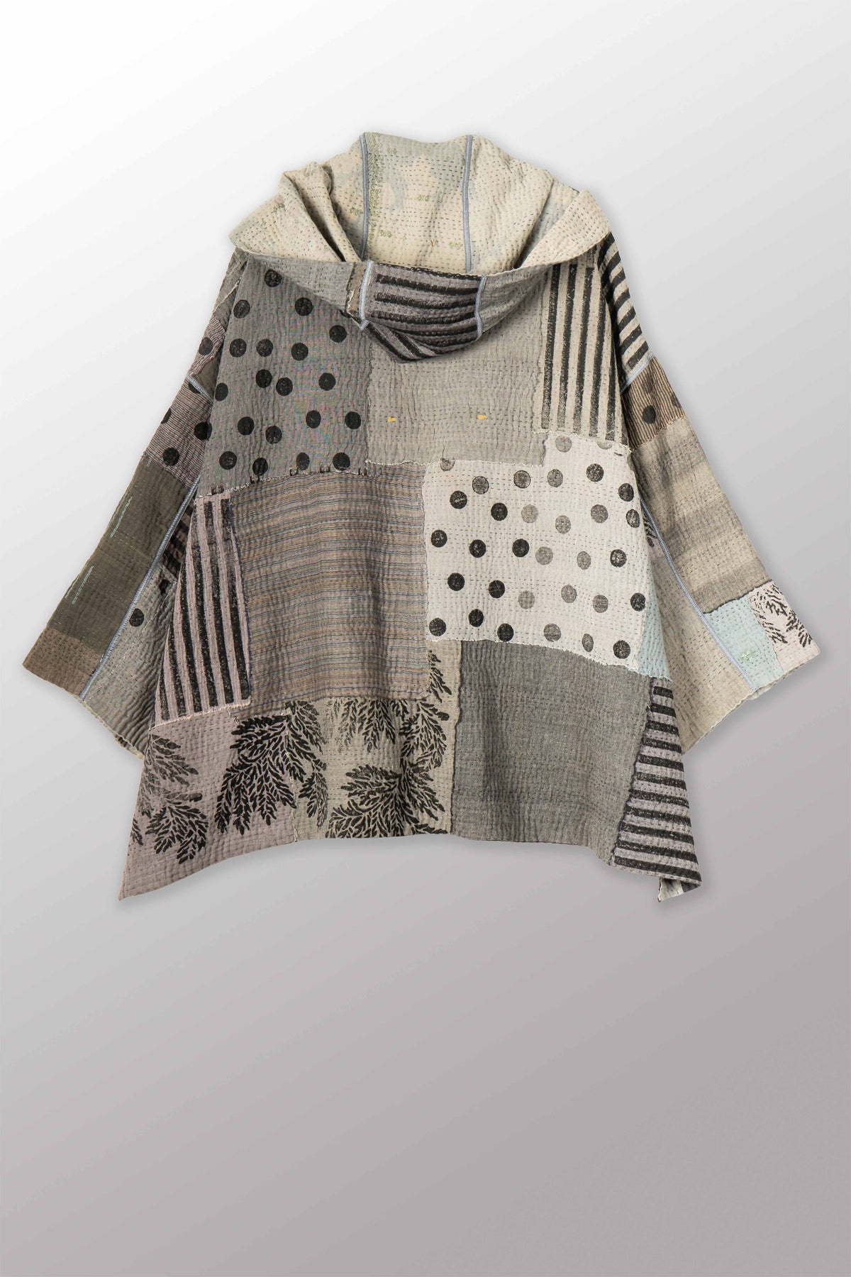 FRAYED PATCH KANTHA WITH STAMP HOODIE PONCHO - sp-fi4064-gry -