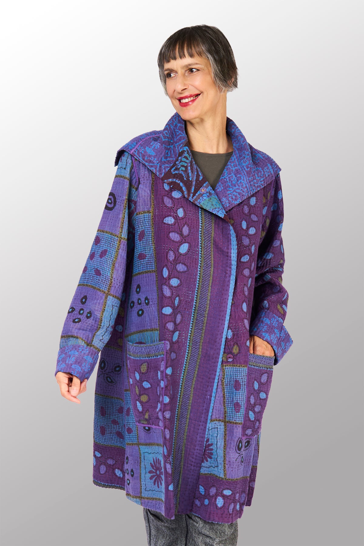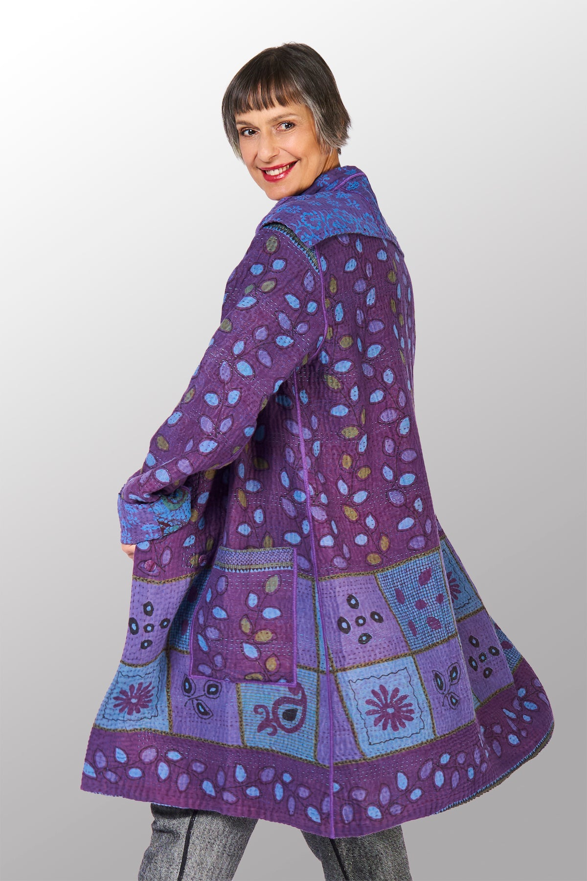 Use a delicate care detergent in cold water without soaking, as this might release some dye. Press and wash without rubbing. Rinse the Kantha garment without wringing.