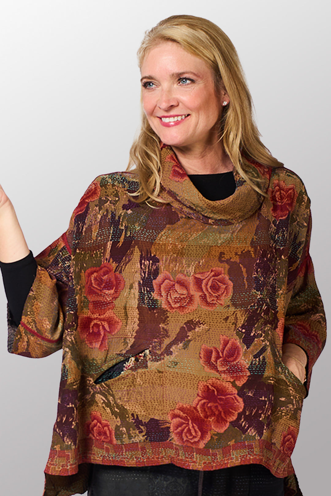 GEORGETTE JACQUARD VINTAGE SILK PATCH KANTHA COWL NECK PONCHO