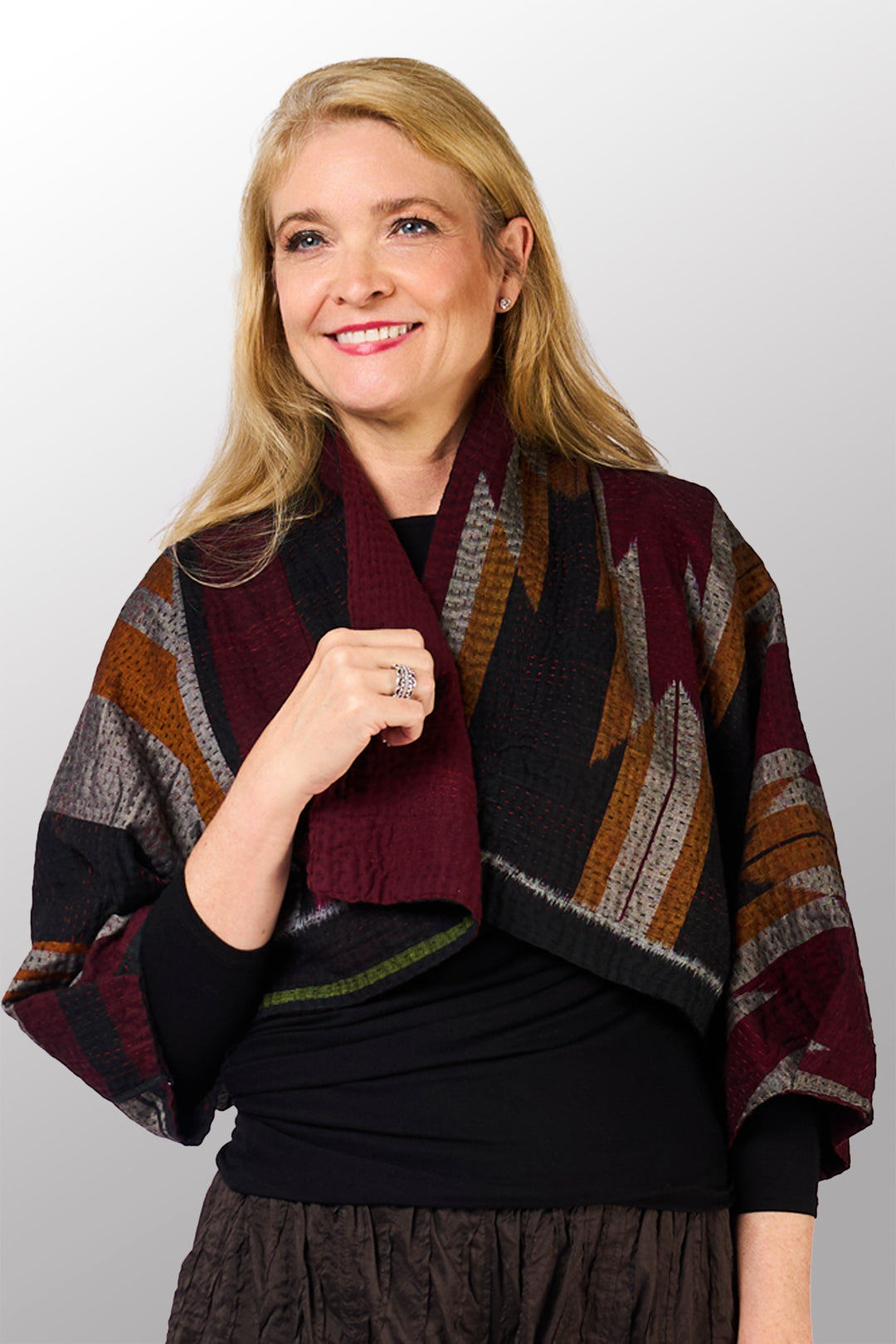 WOVEN HANDLOOM IKAT WITH OMBRE KANTHA PUFF SLV. SHRUG