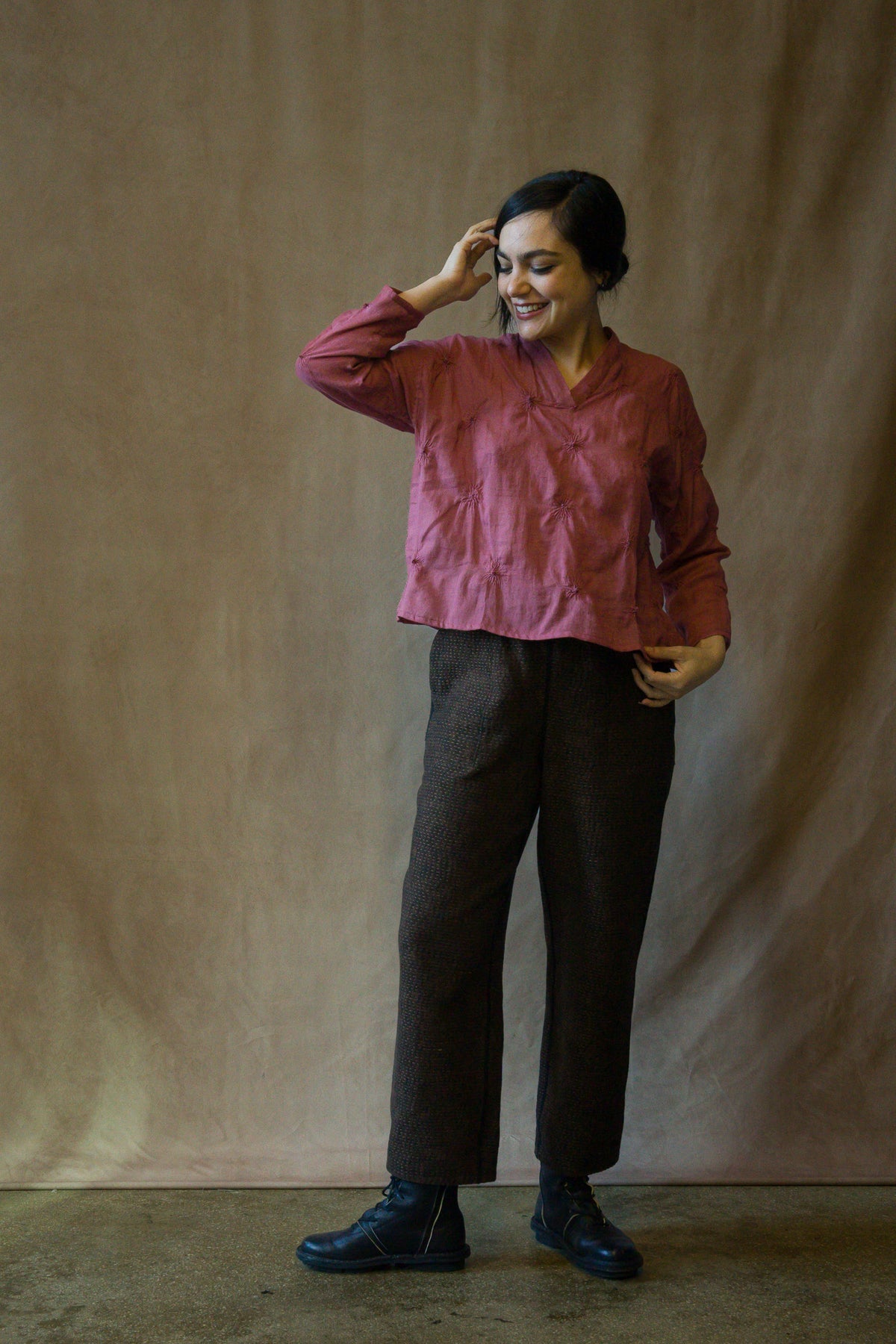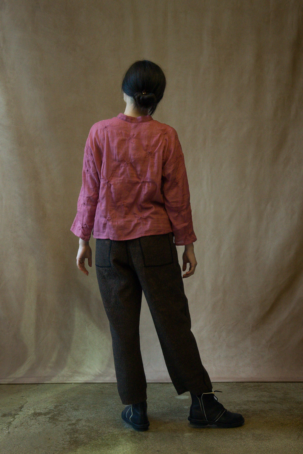 Use a delicate care detergent in cold water without soaking, as this might release some dye. Press and wash without rubbing. Rinse the Kantha garment without wringing.